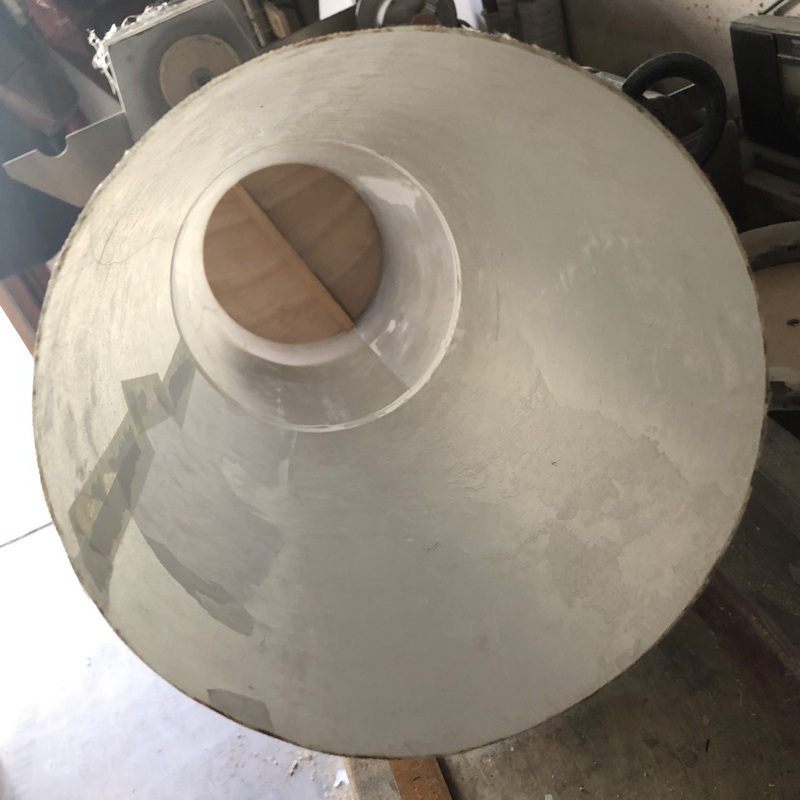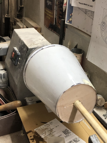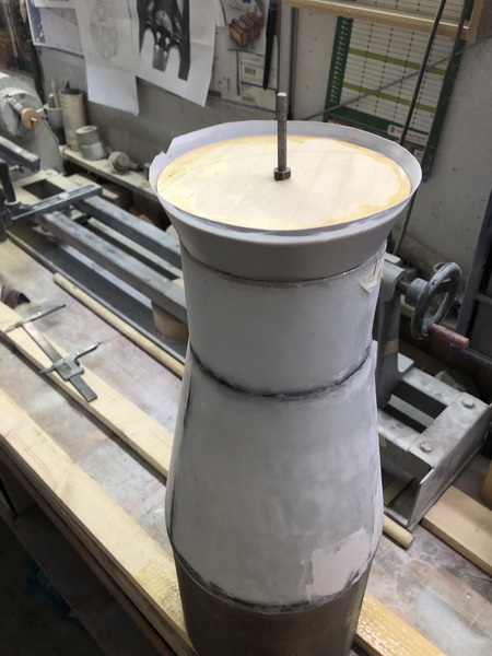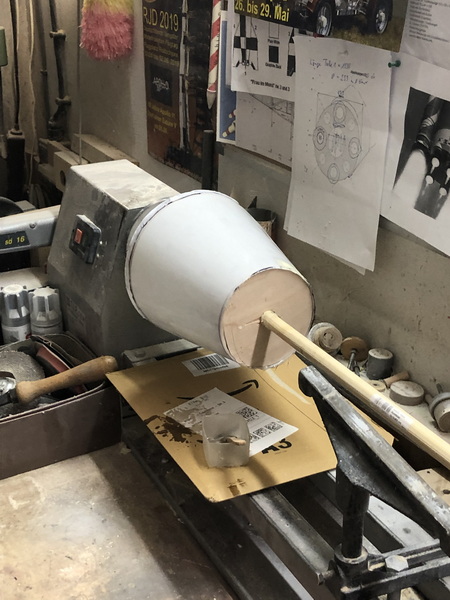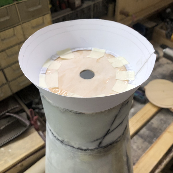Zum Bau des sogenannten "Launch Vehicle Stage Adapter" habe ich erst einmal eine Schablone hergestellt,  mit deren Hilfe ich aus stabilen Zeichenkarton und einem Stab mit Spannten auf der Drechselbank einen Trägerkonus gefertigt, und dann mit mehreren Lagen Glasfasergewebe belegt habe.