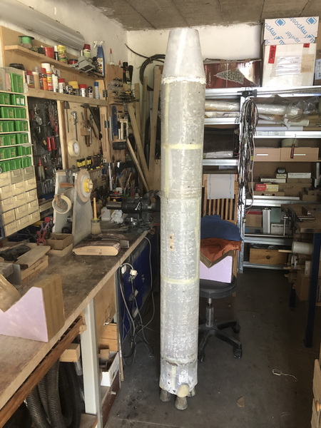 Den Motorblock habe ich ein bisschen grob geschliffen und mit einem Spant versehen, welcher die Aufnahme des Shockcords vorsieht. und eingeharzt. Passt alles. Die Fuge zwischen Tube Hauptstufe und Motorblock ist Absicht und soll so sein. In Zukunft werde ich viel mit spachteln, porenfüllen und immer wieder schleifen beschäftigt sein.