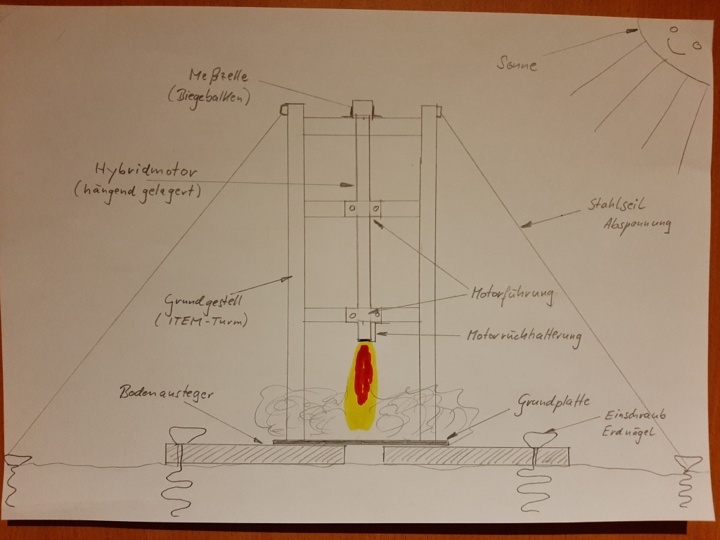 Da ich leider kein geeignetes Zeichenprogramm besitze, habe ich mal schnell etwas mit dem Bleistift skizziert. Ich hoffe ihr seht mir die Einfachheit nach und es ist verständlich Eine Idee wäre ja noch den Abgas/Schubstrahl genau senkrecht auf die Grundplatte treffen zu lassen, das erzeugt dann ja einen maximalen Bodenanpressdruck und verhindert einen Kippmoment wie bei einem schrägen Strahlabweiser. Natürlich müsste dann eine "Opferplatte" oder ein Schamottestein direkt unter den Motor, denn das hält die Grundplatte sonst nicht sehr lange aus... Die einschraubbaren Erdanker, welche Oliver bereits erwähnte, haben echt einen sehr guten Bodenhalt und sind sehr zu empfehlen. Ich habe an meinem Prüfstand auch noch 6mm Stahlseile mit Einschraubbodenankern vorgesehen, die halten schon ne ganze Menge Schub am Boden  ! Andreas