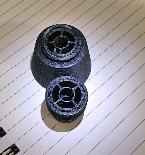 Nach einigen Anläufen habe ich endlich die Spitze für meine Level 1 fertiggestellt. Der Übergang von Metallbearbeitung zu ASA im 3D-Druck war schwieriger als gedacht – die Festigkeiten sind einfach nicht vergleichbar. Ein Millimeter Aluminium ist eben nicht das Gleiche wie ein Millimeter ASA, auch wenn es im CAD-Programm oft massiv aussieht. Ursprünglich wollte ich die Spitze in einem Stück drucken, aber das hat nicht geklappt. Also habe ich mich entschlossen, sie zu teilen. Mein erster Versuch mit einem leichten Verbinder ging leider schief – wie auf dem Bild zu sehen ist, ist er unter Belastung abgerissen. Der neue Verbinder ist nur 5 Gramm schwerer, hält aber problemlos, auch wenn man ihn ordentlich anzieht. Nach dem Wechsel zu gehärteten Düsen sind selbst die Feingewinde M24x1 sehr präzise und lassen sich nach dem Druck mit einer Zahnbürste und etwas Scheuermilch perfekt nacharbeiten und einpassen. Insgesamt bin ich mit dem Ergebnis jetzt sehr zufrieden.