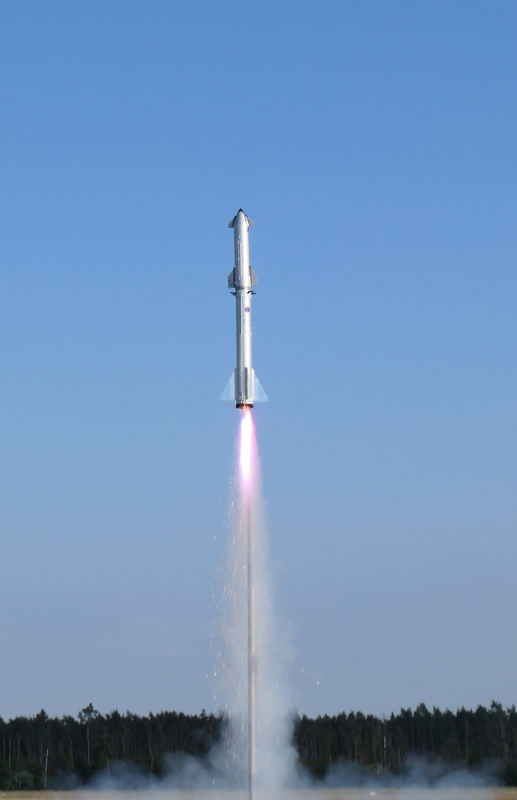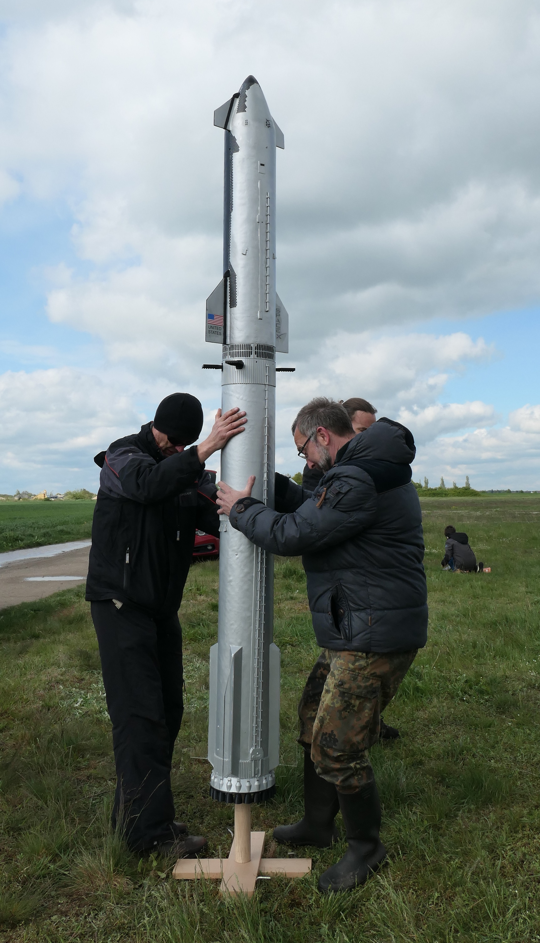 Es wae wie immer ein Event der Sonderklasse es sind so viele schöne Bilder entstanden, dass es mir unmöglich macht, auszusuchen, was am schönsten ist. was das Starship betrifft, hier nur einige Bilder vom Flug: gegen 18.30 stand nach fast 3 stündiger Preppzeit auf der Rampe ich habe keine Ahnung wie zu dem Zeitpunkt meine Herzfrequenz war, als bei 3,2,1 die Zündung erfolgte. mit Getöse machte sich die 19 kg schwere Rocket auf den Weg. Bei 535m hatte die Erdanziehung gewonnen. Die Delayladungen stießen den Main aus. Bei 200m trennte sich auch der Rest. Der Booster wollte unbedingt im Wald landen, wo bei der Landung eine Acrylflosse abgebrochen ist. Ansonsten keine Schäden. Alles bestens. Ein großartiger Flug bei dem alles geklappt hat. Ich bin wirklich zufrieden. Ein großes Dankeschön an das Team, die MotorSponsoren sowie die vielen Helfer, welche das Starshipprojekt zu den großartigen Erfolg gemacht haben. Ich bin dabei eine Slideshow von dem Event zu erstellen. Den Link auf YouTube werde ich hier reinstellen. Rolli |