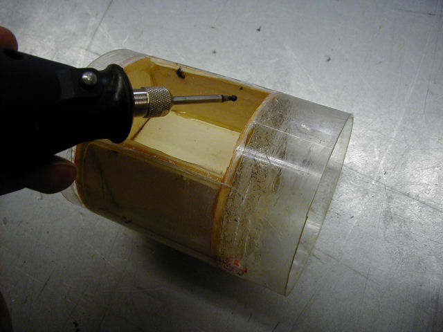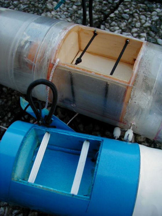 Moin! @ FalkE: Ich hab hier nochmal für dich eine Detailansicht der Gummibänder, die die Schirme auswerfen. Die Löcher dazu bohre ich in die Innenseiten der Wände der Fallschirmkammer. Sie sind ca. 1,5 cm vom oberen bzw. unteren Rand der Kammer entfernt. Die Gummis ziehe ich dann komplett durch alle Löcher durch und verknote sie. Die Spannung der Gummis muss groß genug sein, um die Fallschirme auszuwerfen und darf aber nicht zu groß sein, sonst werden die Türen der Fallschirmkammer bei gespanntem Timer etwas aufgedrückt. Ist also ne Einstellungssache. Hier noch ein Bild von einem großen und einem kleineren Fallschirmmodul. Du kannst als Gummis entweder Hosengummis oder ähnliches nehmen. Gruß Robert