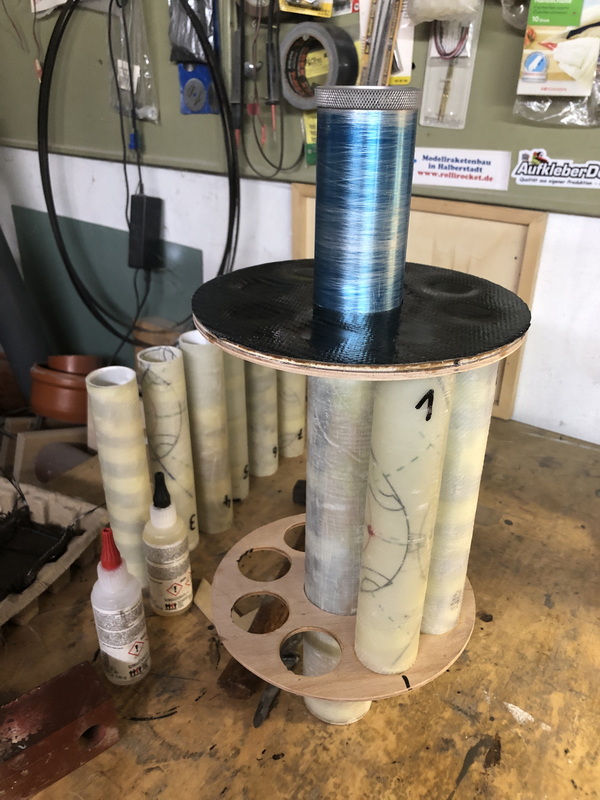 Mit einer Lage Carbon belegt, die Motoröffnungen schneide ich zum Schluss aus. Das Einkleben der Motorrohre ist nicht so einfach. den Abschlussring kann ich erst einkleben, wenn alle Motorrohre am Anfang fest sind. Auch muss ich den Abschlussring vorher noch auf Passung drehen, den Durchmesser weiß ich erst dann, wenn der Schubring im Inneren der Tube eingeklebt ist. Boah - ist schwer das alles zu beschreiben.