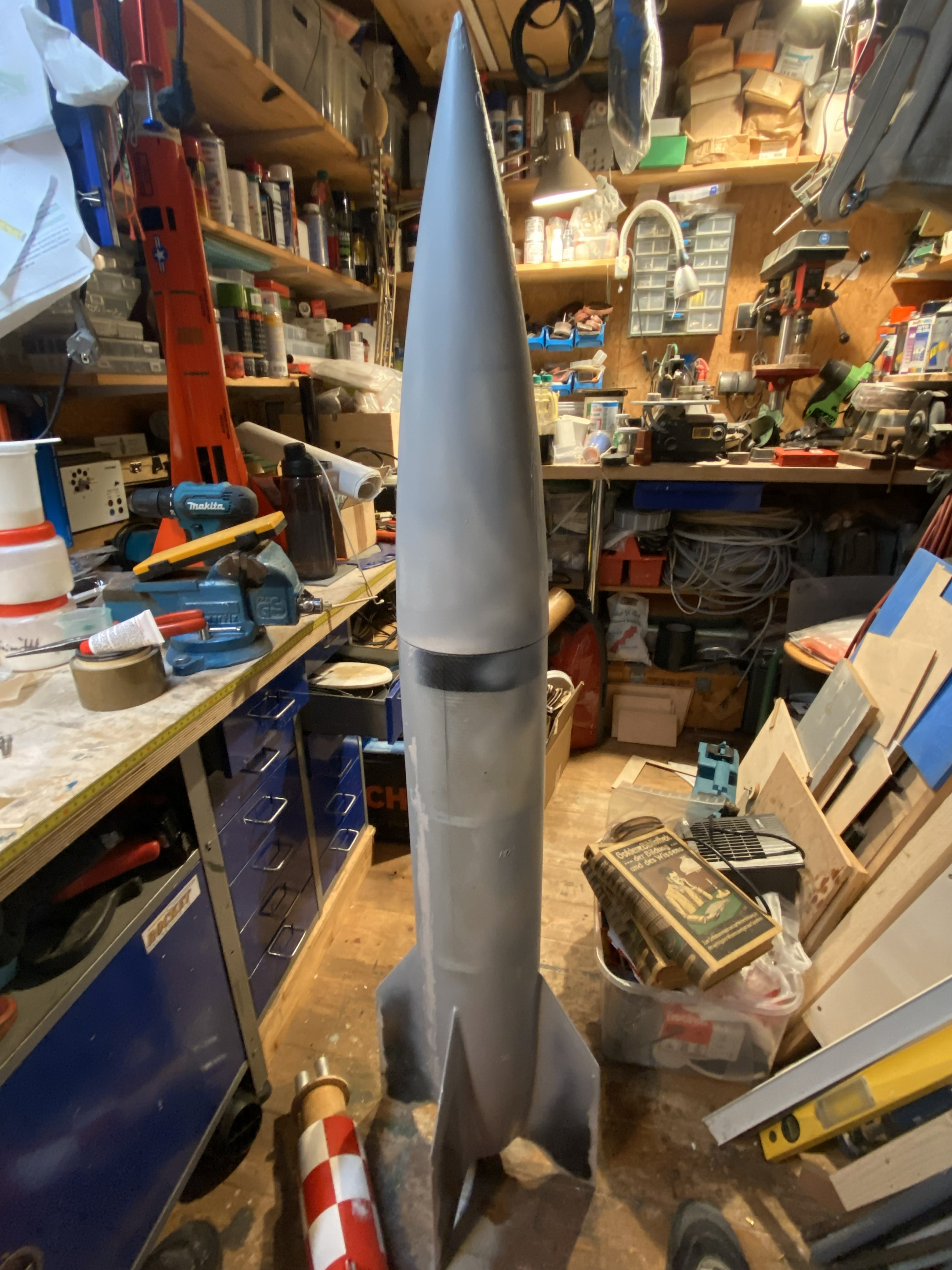 Zurück zum eigentlichen Thema. Der Postbote war (trotz der Witterung) fleißig. Zwei weitere Kleinigkeiten sind geordert, aus denen die seitlichen kurzen und breiten Lufthutzen am Heck der Rakete werden sollen. Etwas ratlos bin ich noch im Hinblick auf die Kettenkästen an den Finnen, mir fehlt die Möglichkeit des 3D Drucks, das wäre glaube ich das Optimum. Die viel zu stumpfe und unscalemäßige Spitze hat eine richtige spitze Spitze aus Epoxy bekommen. In der Spitze steckt eine Schraube, die als Gerüst für die Glasmatsche dient. Die letzte Macke ist verfüllt und muss noch final in Form gebracht werden. So kann das dann bleiben. An den Finnen hat es Fillets gegeben und ich hab mich bemüht alle Lunken und Löcher in der Oberfläche mit Feinspachtel zu schließen. Hier und da hat es grauen Haftgrund/Filler gegeben, um die Macken besser sehen zu können. Naßschleifen und ähnlichen Schweinkram mache ich normalerweise draußen, aber bei Schnee und Eis und 9 Grad Minus, hab ich mir ein olles Handtuch auf den Boden der Werkstatt gelegt und mit warmem Wasser eine Indoor Schweinerei unter engsten Platzverhältnissen veranstaltet. Ich bin noch weit weg von Lackierfertig, aber unter den aktuellen Umständen sieht das schon brauchbar aus. Ist eh kein Wetter in Sicht, um mit Lackfarbe zu hantieren.
