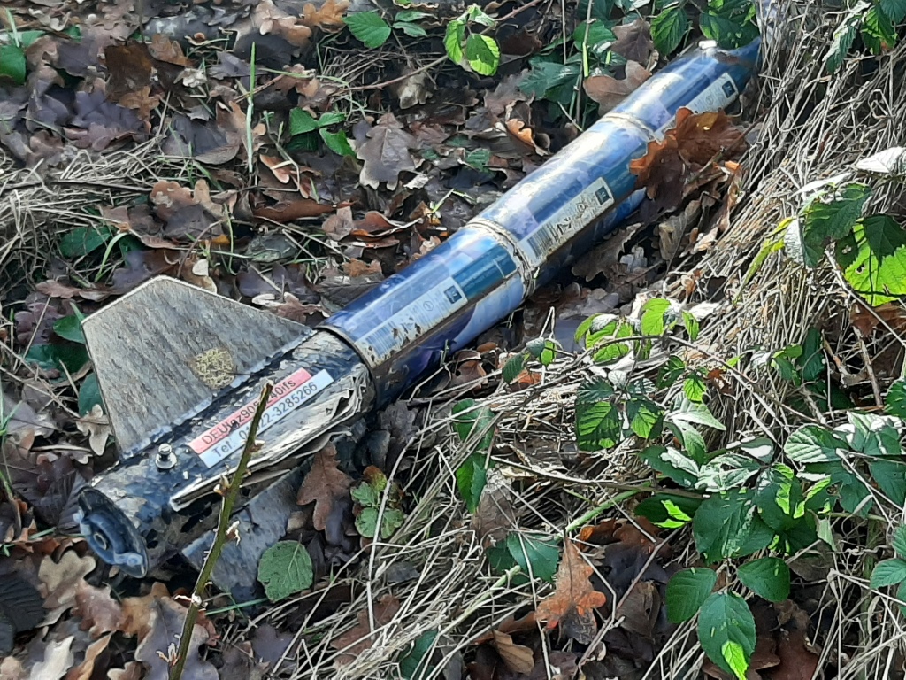 Jetzt ist es ja schon 27 Monate her, das sich meine "FAXE" in einem Baum im Roitzschjoraer Wald verheddert hatte. Bisherige Bergungsversuche blieben ja bisher leider erfolglos.... Da ich heute mal wieder in der Gegend war, dachte ich, ich könnte ja einfach mal wieder bei ihr vorbei schauen.... Und was soll ich sagen, die Kevlar-Schockleine hat nach fast 2 1/2 Jahren im Baum endlich "aufgegeben" und sie wieder frei gelassen... Vom Fallschirm ist nicht mehr viel übrig. Die Sperrholzflossen haben ihren Lackierung verloren und sind aufgebläht, Aber das wichtigste ist, das 38er Aerotech Casing hat das die lange "Hängezeit" gut überstanden und ließ sich auch sofort problemlos öffnen Und das lustige dabei ist, der Pfandflaschenautomat beim Netto hat den Strichcode der doch schon stark korrodierten Faxe-Büchsen noch erkannt und ganz brav die 25 Cent Pfand pro Büchse ausgezahlt...  ! Ich spiele ja mit dem Gedanken, die FAXE einfach noch mal neu zu bauen... Andreas