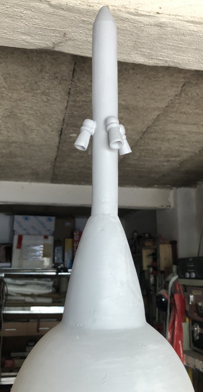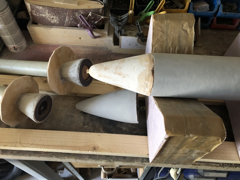 Die Boosterspitze hat mir nicht gefallen, bzw. ist mir nicht gelungen. Zu lang, schlechtes Holz, unrund Deswegen noch einmal gedrechselt. So wirds wohl was. Musste allerdings auch etwas spachteln.