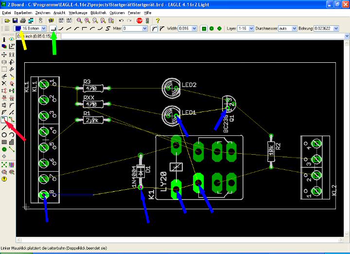 Doch nun zum Manuellen Routen !! Das geschieht mit dem ROUTE-Befehl (roter Pfeil). Wir wählen den Routebefehl aus, und klicken dann z.B. auf das untere Signal(GND) an unserer Klemmleiste.(rechter blauer Pfeil). Es leuchten dann alle Stellen auf, an welchen das GND Signal anliegt und wohin auch die Leiterbahn gezogen werden muss. Durch klicken mit der rechten Maustaste können wir den Abknickmodus einstellen(45Grad, 90Grad, usw) der gewählte Modus ist oben in der Leiste sichtbar(grüner Pfeil). Den Layer in dem wir routen, können wir über das Pulldown-Menü(gelber Pfeil) wählen. Bei unserer Platine macht ja Bottom sinn !!! Es werden nun so nacheinander die Lötaugen der Bauteile mit den Leiterbahnen verbunden. Geändert von icepic am 03. Februar 2007 um 19:27 Die Frage ob man den "neusten" PC hat, beantwortet man sich, wenn man links neben der SPACE-Taste schaut !!!! |