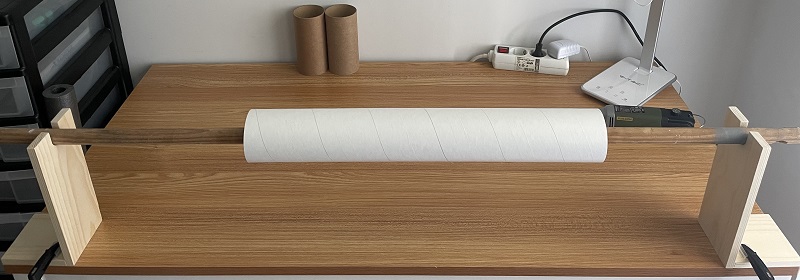 Ich habe heute eine kleine Vorrichtung für das laminieren der Rohre gebaut. Es ist jetzt nicht das Gelbe vom Ei, dass geht definitiv noch besser, aber es erfüllt seinen Zweck und man kann damit arbeiten.