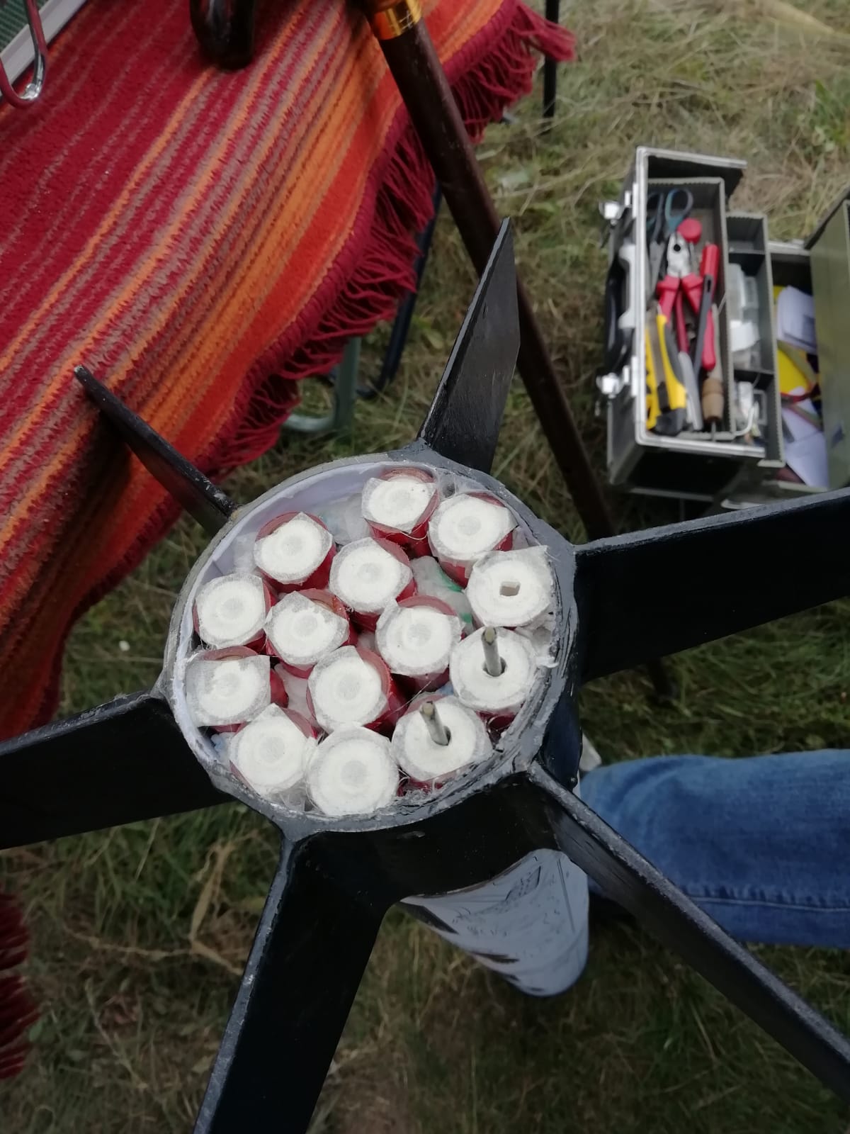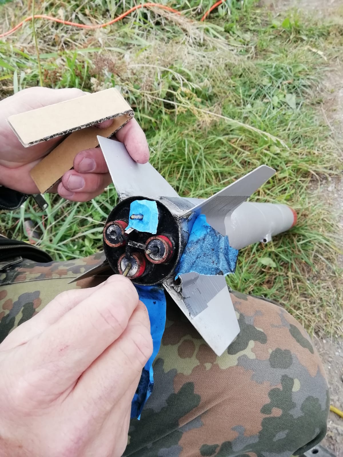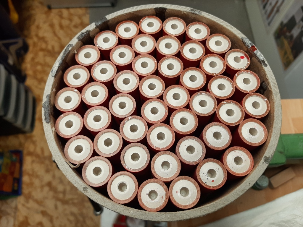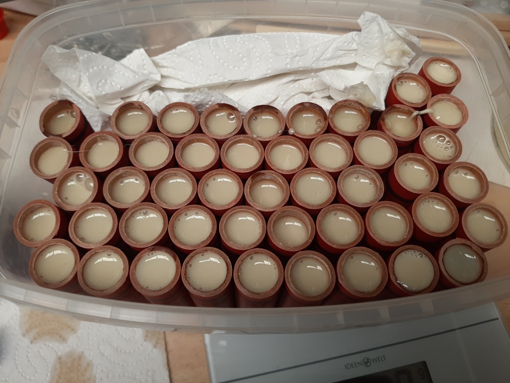 He Alex, ich kann aber auch kleiner....  ! Ich habe noch eine größere ältere Charge von D9-7 Klima-Motoren, welche zwar 2015 erfolgreich in der MEDUSA 3 (damals auf deiner Rampe) geflogen sind, ich bin mir aber nicht sicher ob die jetzt auch noch zuverlässig funktionieren... Zur Sicherheit werde ich noch mal zwei gleiche 48er Booster für die MEDUSA 3 fertigen aber einen davon zum testen "nur" statisch am Boden auf den Prüfstand stellen.....  ! das Papprohr für den Einweg-Booster die Schubplatten werden eingeklebt, die Motoren zum auszählen eingelegt, am Heck werden sie wieder zuverlässig mit diesem Resin Gießharz verschlossen, das hat den Zweck, wenn einer der Motoren ungeplant durchzünden sollte, wird keiner seiner "Nachbarn" von hinten gezündet... Am besten das angemischte Resin in einer kleinen Spitze ansaugen, so lässt es sich sicher und schnell in den hinteren Verschluss der Motoren dosieren...
