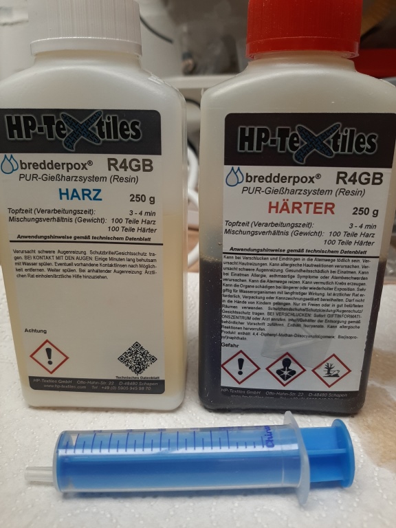 Da habe ich gesucht, leider nur große Flaschen mit 800g, das war mir dann zuviel und für den minimalen Zweck zu teuer. %Bild1 Ich werde die kleinen Zwischenräume mit Glasrestern ausstopfen und etwas Harz reinlaufen lassen. Ist sowieso nur eine Onewayrakete. Ciao, Rolli