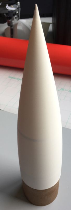 Die Spitze war heute morgen fertig, ich habe sie mit 0,8mm Wandstärke gedruckt, das sind genau zwei Bahnen, ohne dass der Drucker da Füllmaterial zwischenlegen muss, das geht dann schneller. Sie ist so gebaut, dass ich unten ein Stück Kuppler einstecken kann, dadurch passt es dann auch genau in das Körperrohr. Zwei Verstärkungsringe sind mit eingedruckt um die Stabilität etwas zu erhöhen, und die oberen 10 mm der Spitze sind massiv. An der Stelle der Ringe wölbte sich die Oberfläche ein bisschen, das war aber nach dem Abschleifen weg. Insgesamt eine sehr praktikable Methode passende Spitzen herzustellen, jede beliebige Form ist möglich.