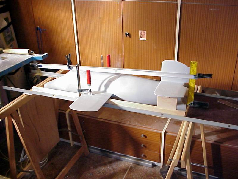 Die denken, ich habe so was wie einen Raketenbaum  muss immer feste gießen... Habe es heute gewagt und das Heck eingeklebt. Zuvor habe ich mir ein gerades und paralleles Gestell aus Winkeleisen und Leisten gebaut wo die Bachem Natter an den Flügeln angeklemmt wurde. Alles ausgemessen und alle Seiten parallel gestellt. War nicht so besonders schwer das Heck auszurichten... Folgende Datei wurde angehängt: