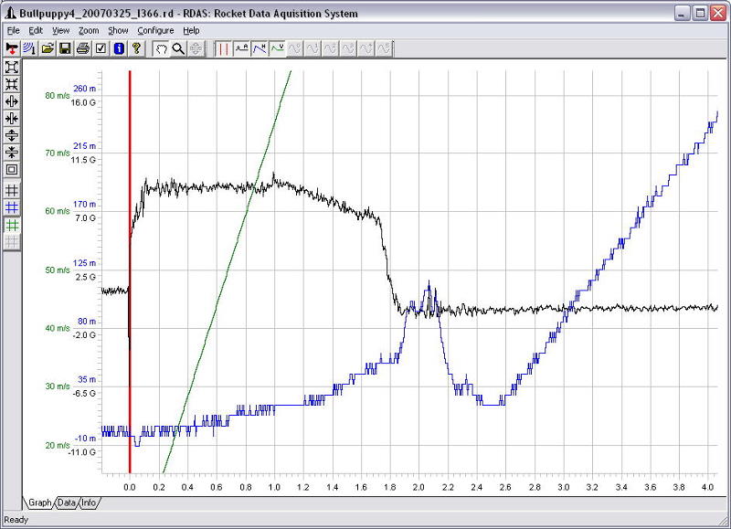 Sobald aber irgend eine schnell veränderliche Störung auftritt (f>2.5Hz), Machdurchgang, allenfalls Druck-Oszillationen wegen Hybrid (ich sehe noch nicht wie die wirklich bis zum Drucksensor kommt, denn die Integration der 180Hz Beschleunigungspulse über die Masse der Rakete wird nicht zu einer sichtbaren Welligkeit im Höhenverlauf führen. Es sei denn irgend etwas schwingt in der Elektronik-Bay mit, zum Beispiel der Höhenmesser selber), plötzlicher Anstellwinkel wegen Scherwind) wird Nyquist verletzt, die Ausgangsdaten sind nur noch bedingt vertrauenswürdig und "im Rahmen der Schwankungen" zufällig.