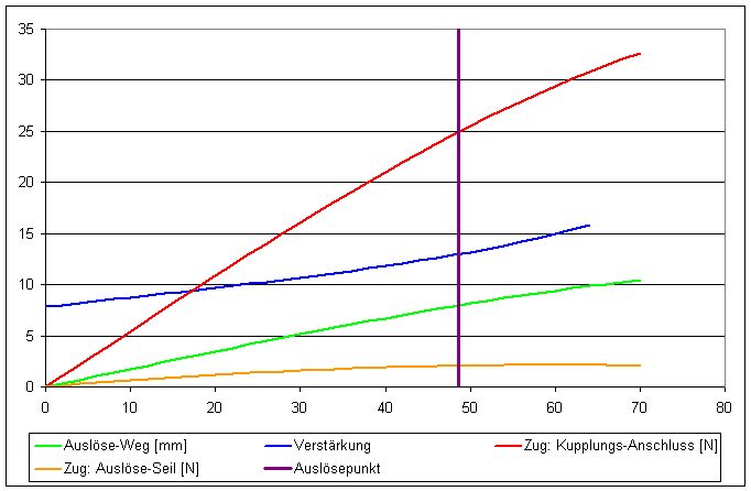 Man erkennt, dass die "externe" Seil-Zugkraft (orange) maximal ca. 2N beträgt. Bei Zugversuchen mit dem Hebel konnte ich die Kupplung bei ca. 2,4N auslösen, es werden durch Reibungsverluste also zusätzlich 0,4N benötigt.