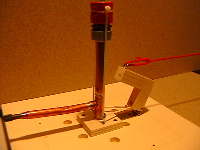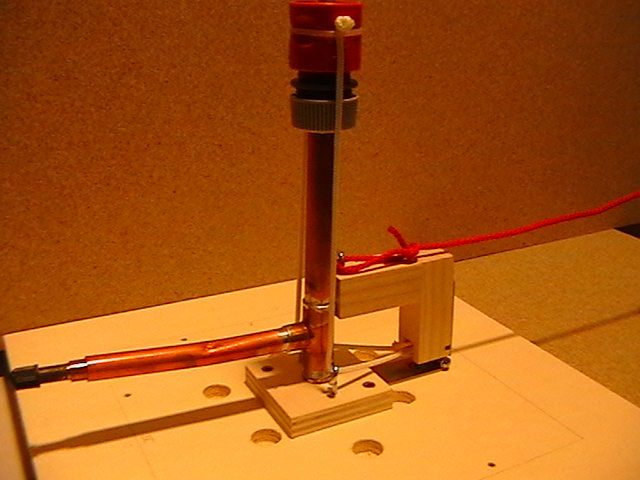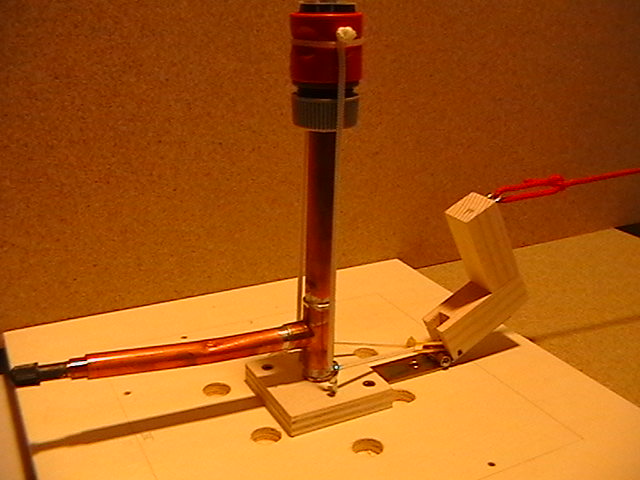 Wie man auf den Bildern unten vielleicht nicht so gut erkennen kann: Die Rampe ohne den Kasten-Aufbau lag ohne Befestigung auf einer Pressspanplatte und selbst bei vollem Zug ist sie nicht von der Stelle gerutscht. Wenn also später die fertige Rampe mit Rakete auf dem Boden steht, ist möglicherweise nicht einmal eine Befestigung am Boden nötig, um die Rampe in Position zu halten (was ich aber grundsätzlich nicht empfehlen würde).