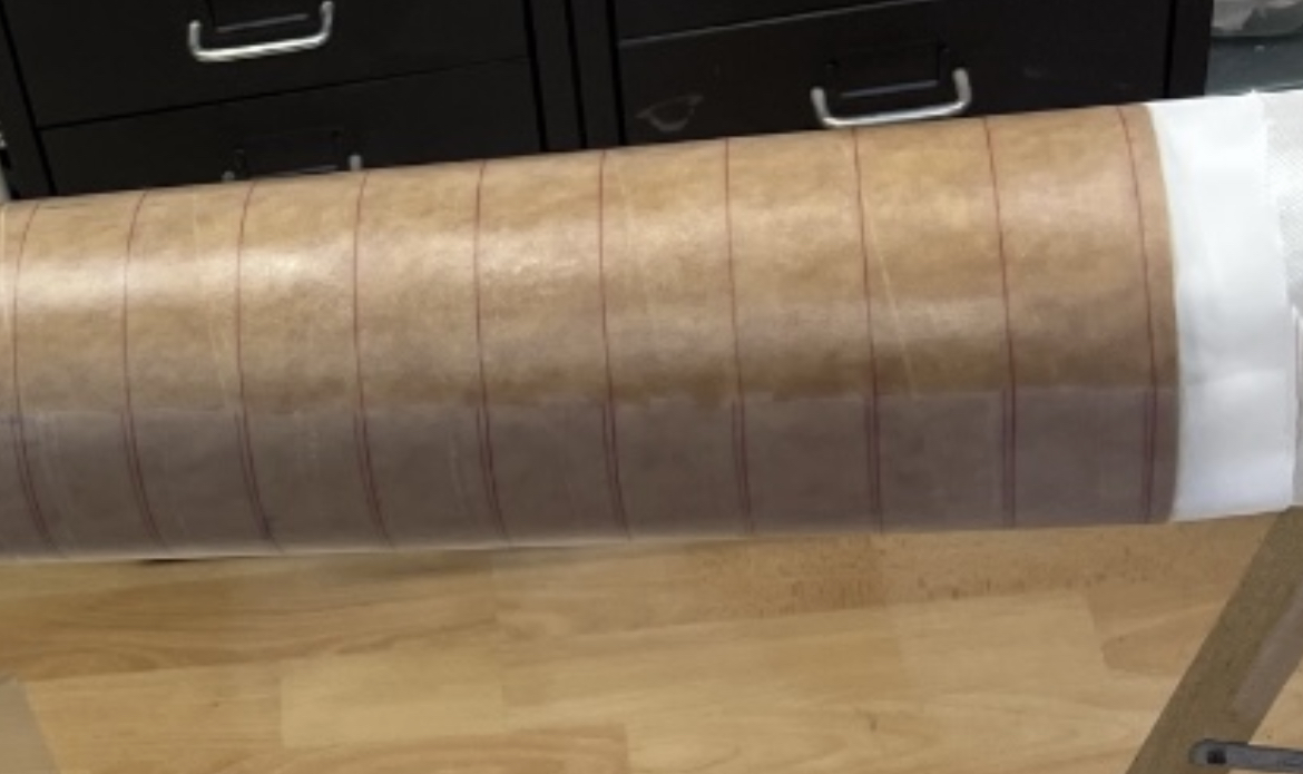 Schau so sieht es bei mir aus.. das Abreisgewebe ist auch nicht vorgetränkt aufgelegt. Durch das stramme anrollen zieht es dann alles überschüssige Harz aus dem darunter liegenden Gewebe .. manchmal gebe ich sogar noch etwas Harz nach … Ziel ist alles stramm und faltenfrei sowie gleichmäßig durchtränkt zu haben … Am Ende nach dem Abreisen (Quasi die Abreisgewebe Matrix aus dem getrockneten Harz ziehen) ergibt sich so die feine und gleichmäßig raue Oberfläche. Das Abreisgewebe kann auch gerne am Ende überlappen… Grüße Marco