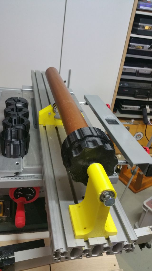 An die Spannzange kommt jetzt noch eine Teilscheibe für die gängigen Winkel. Einen Antrieb habe ich auch angedacht um die Rohre drehen zu lassen, z.B. um sie zu schleifen oder schneiden zu können. Das ganze ist bisher sehr stabile geworden aber bei weitem kein Präzisionsgerät für arbeiten auf den 1/100.