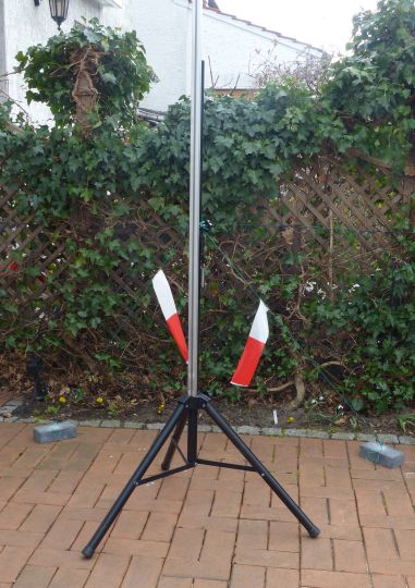 Beim Testflugtag auf der Roten Jahne musste ich leider feststellen, dass meine Rampe, die ja im wesentlichen aus einem Lausprecherstativ besteht, umgefallen war bei Wind von ca. 10 m/s. Ich habe daher die hohlen Beine mit Sand gefüllt, die Füllung mit etwas Küchenkrepp abgedichtet und Harz draufgegossen. Außerdem fanden sich noch zwei Ziegelsteine, die ich für Abspannungen verwenden konnte: