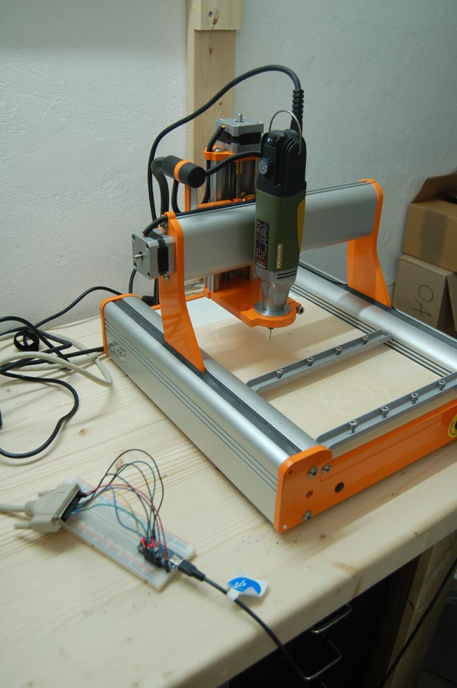 Lackierkabine passt erstmal nicht (es sei denn ich würde die Rumpelkammer unter der Treppe ausräumen, da liegt nur Bauschutt ;-), aber die Fräse läuft jetzt. Da ich das USB-Modul von Stepcraft nicht habe und mir nicht sicher bin ob es mit beliebiger Steuersoftware funktioniert, habe ich erstmal einen Arduino Nano mit GRBL an die parallele Schnittstelle gehängt. Irgendwann wird das auch mal eine eigene Platine und ein Gehäuse bekommen.