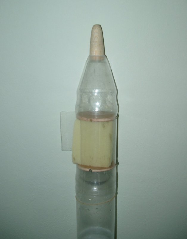 Hi Bäckchen! ja das war auch ein Punkt an dem ich fleißig überlegt habe... Diese Spitze hat dann schon viele Vorteile. Das mögliche Einfüllen von oben, 0,3 Liter Volumen mehr  , doch der enscheidende Punkt war das Fallschirmmodul an sich. Ich hab es nur aus einer Flasche gebaut und deswegen wurde der Platz zu knapp um die Spitze oben dranzulassen. Ich hoffe man kann das auf dem Bild erkennen: PS: danke für das Lob