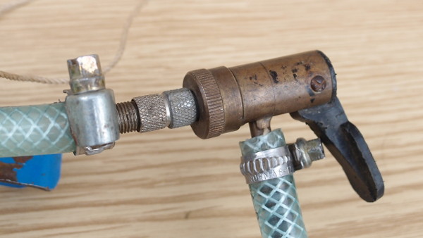 Das Einweg-Ventil ist ein Fahrradventil (Blitz-Ventil), auf welches ein Ventiladapter für Autoventil-Anschlüsse geschraubt wurde, sodass man dort einen Schlauch oder einen normalen Ventil-Anschluss anbringen kann. Das Ventil ist so herum eingebaut, dass es schließt, wenn der Druck in der ersten Stufe größer ist als auf der Seite, die dem T-Stück zur zweiten Stufe zugewand ist, und andernfalls öffnet.