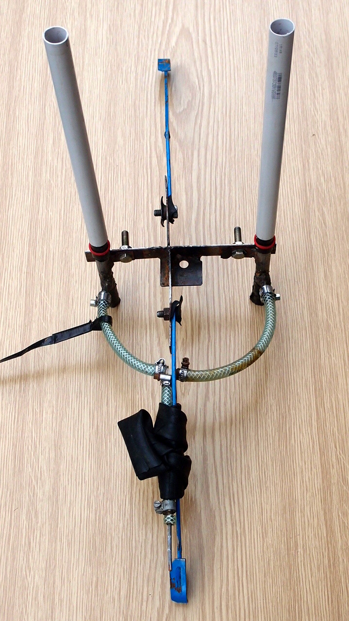 Die schnell lösbaren Druckluft-Verbindungen hab ich letztes Jahr entwickelt. Eine Verbindung besteht aus zwei abgesägten Fahrrad-/Autoventil-Schäften, die aufeinander gepresst werden und über eine innen hineingesteckte rohrförmige Dichtung verbunden und abgedichtet werden. Die Dichtung besteht aus einem Stück eines Kunststoff-Trinkhalms mit einer Lage Duct-Tape darüber. Damit die Dichtung beim Aufeinanderpressen nicht einknickt oder Falten bildet wird innen noch ein Stahlstift hinein gesteckt, der gerade so in die Dichtung hinein passt. In den Stift wurde eine Längsnut gesägt, um die Druckluft durchzulassen. Wenn das Gegenstück der Druckluft-Verbindung ein Autoventil ist - wie im Falle der Verbindung zur zweiten Stufe - dient der Stift auch dazu, das Ventil offen zu halten, bis die Verbindung gelöst wird. Der Anpressdruck wird von einer Klammer aufgebracht, die aus einem Stück PET gefertigt wurde (durch Erhitzung mit einem Bügeleisen). Auf beide Ventilschäfte ist jeweils ein kurzes Stück Schlauch geschoben. Die PET-Klammer umgreift mit beiden Enden das eine Stück während sie mittig auf das andere Stück drückt. Um die Klammer geschlossen zu halten ist sie von einem Vierkantrohrstück umgeben, das ebenfalls aus PET geformt wurde und mit Duct-Tape zusammengehalten wird. Es ist an gegenüberliegenden Seiten mit einer stabilen Schnur verbunden. Wenn man an der Schnur zieht, kann man schnell und mit wenig Kraft die Verbindung lösen. Bei Bodentests stellten sich diese Verbindungen als ausreichend dicht bis 7 bar heraus, aber im Flugbetrieb gab es gelegentlich schon deutliche Lecks ab 4 bar, wenn die Länge der Dichtung nicht genau stimmte und der Anpressdruck zu niedrig war. Letzterer ist einstellbar über die Position der Schlauchstücke auf den Ventilschäften und Erstere ist einstellbar mithilfe einer Schere oder mit Ersatz-Dichtungen, die zumindest schnell hergestellt sind und fast nix kosten.