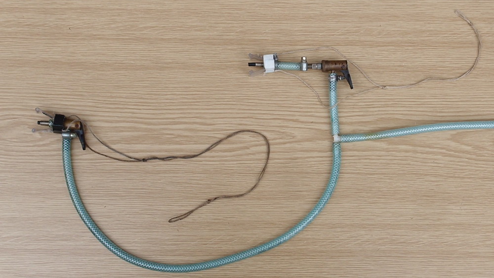 Von der Pumpe ausgehend führt erst ein ca. 10 m langer Schlauch bis kurz vor die Startrampe. Über ein T-Stück sind dann zwei Schläuche angeschlossen: einer führt direkt zur Druckluft-Verbindung der zweiten Stufe, der andere zunächst zu einem Einweg-Ventil und danach zur Druckluft-Verbindung der ersten Stufe.